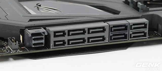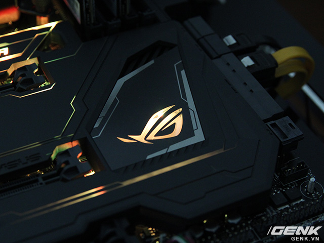 Đây là mạch led đặt trên tản nhiệt chipset, thắp sáng cho logo ROG. Ngay bên dưới tản nhiệt chipset là cổng M.2 SATA cho các SSD chuẩn M.2. Cổng này đặt bên dưới lớp giáp, nghĩa là người dùng muốn lắp / thay / tháo ổ sẽ phải gỡ giáp ra. Hóa ra để đẹp cũng có nhiều cái bất tiện.