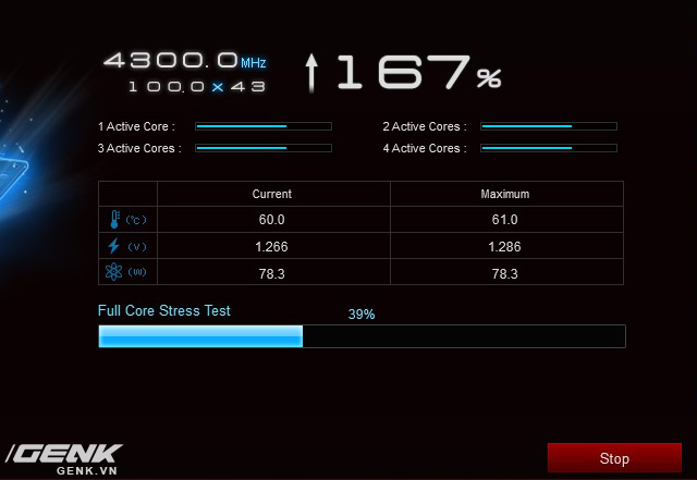 Bắt đầu chiến: AI Suite khởi đầu với mức xung 4,3 GHz. Phần mềm lần lượt stress 1 nhân, 2 nhân, 3 nhân, 4 nhân để kiểm tra độ tương thích.