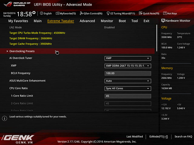 Cách 2: Vào Bios -> Extreme Tweaker -> Load Gamer’s OC Profile