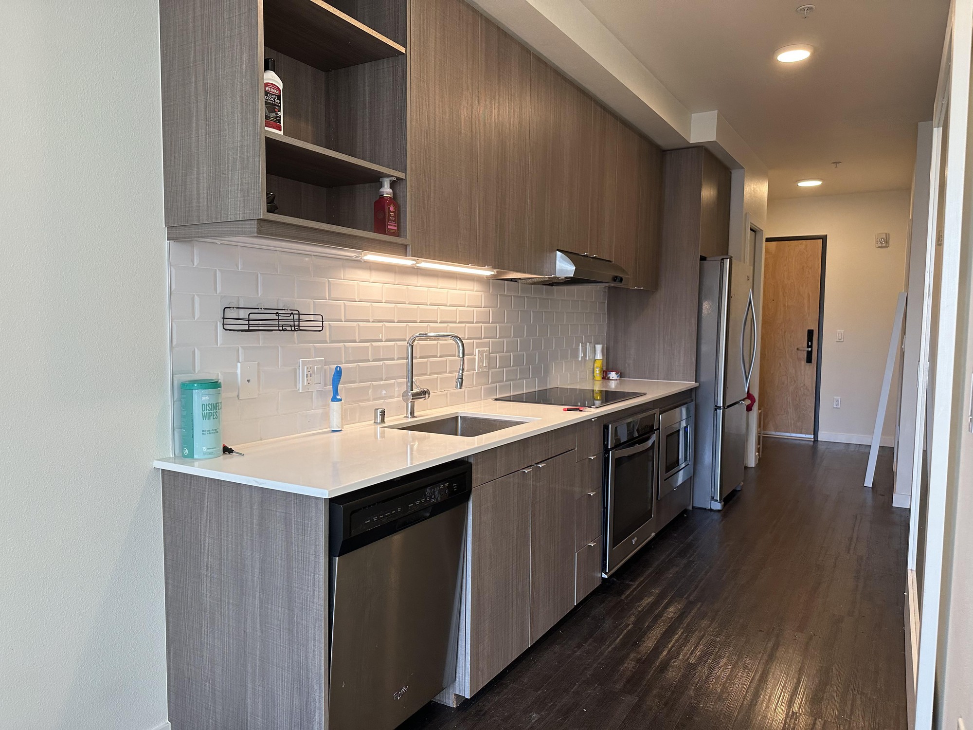 Nằm sát cửa ra vào là khu vực bếp. Không gian này rộng rãi, đầy đủ đồ dùng và phù hợp với sinh hoạt một người