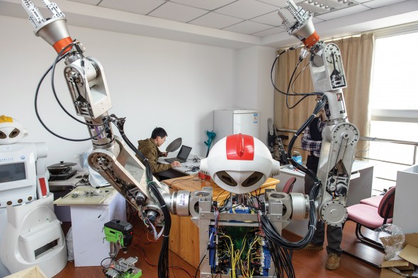 Trong phòng thí nghiệm là giáo sư Zhu Xiangyang và hơn một trăm nhân sự già trẻ đang thử nghiệm những mẫu robot mới nhất. Ở một phòng, những nhà nghiên cứu trẻ đang thử nghiệm một chiếc xe lăn được điều khiển bằng não bộ. Ở một phòng khác, một con robot dài và mềm dẻo như loài rắn đang được thử nghiệm chui vào những địa thế khó khăn chật hẹp. Thậm chí, công nghệ xe tự lái cũng đang được thử tại đây.