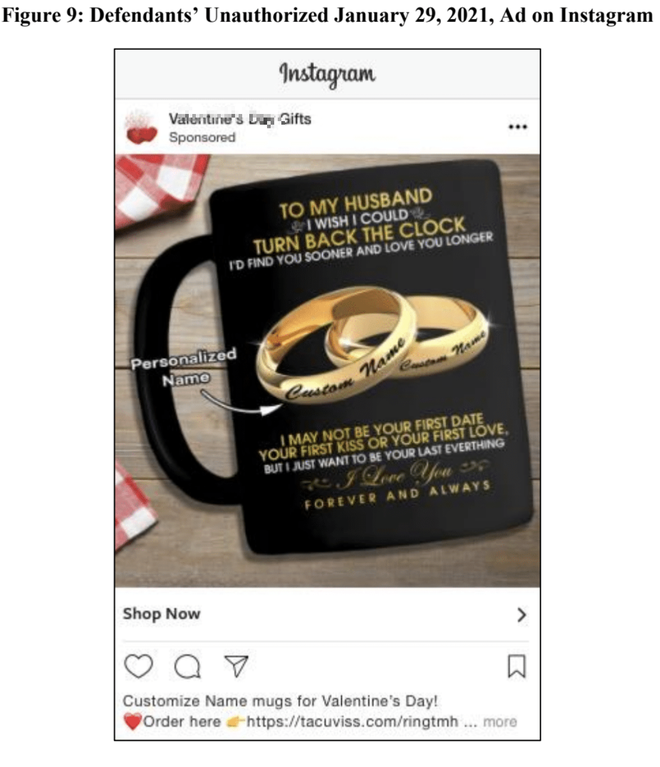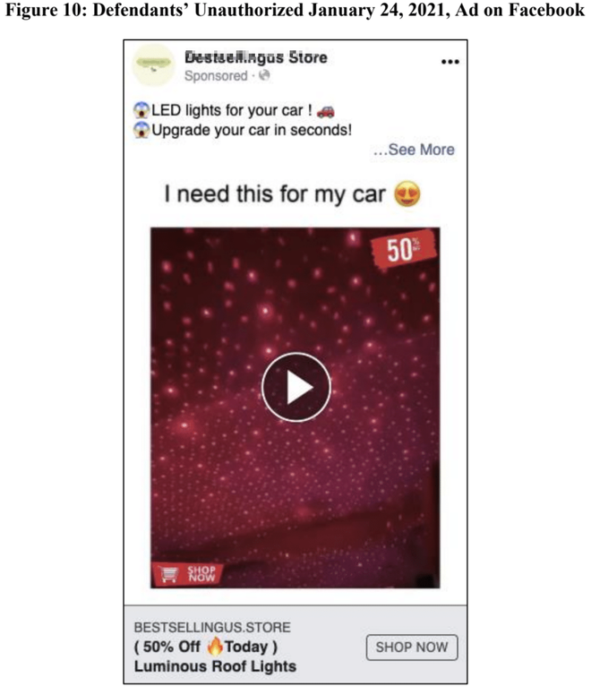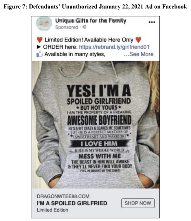 Trong đơn kiện dài 35 trang của mình, Facebook còn công bố các bằng chứng cho thấy 4 bị đơn đã rao bán, cho thuê quyền truy cập vào các tài khoản bị xâm phạm cho các nhà bán hàng online tại Việt Nam, thông qua quảng cáo video trực tiếp. Mạng xã hội này cũng chỉ đích danh những website, fanpage, instagram sử dụng quảng cáo trái phép, bao gồm: dragonwtee88.com, delphine.family, biglovetee.com, coolprintusa1.com, lion-print.net,…