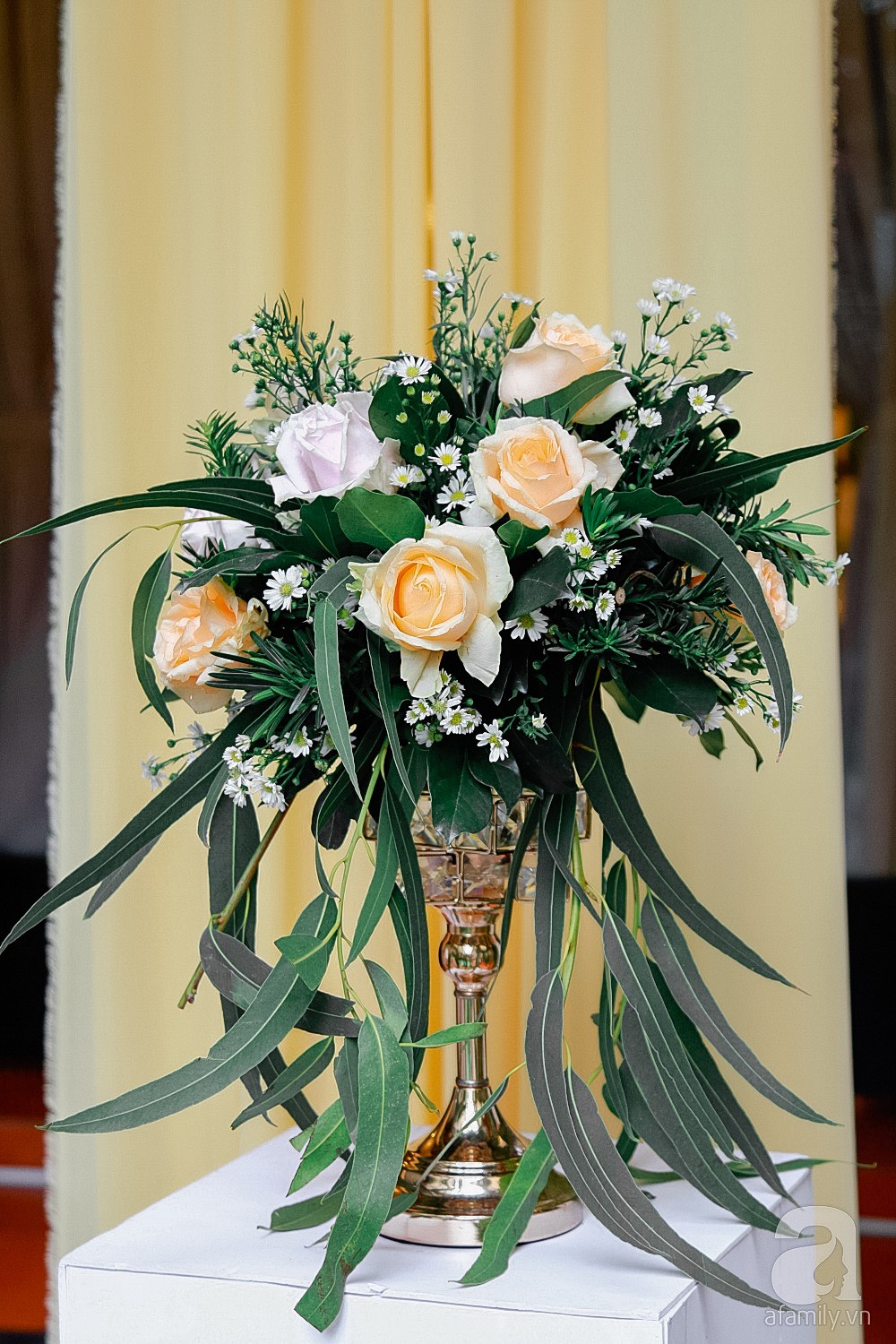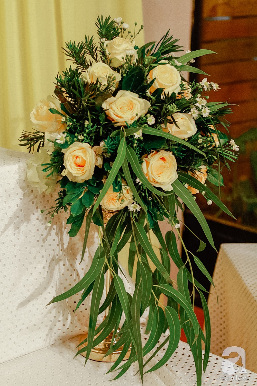 Lấy tông vàng gold làm màu chủ đạo, không gian tiệc cưới từ cổng chào, phông nền, ghế ngồi,... đều toát lên sự ấm cúng, sang trọng. Ngoài ra, cổng hoa và bàn ăn đều được trang trí với hoa hồng đầy lãng mạn.