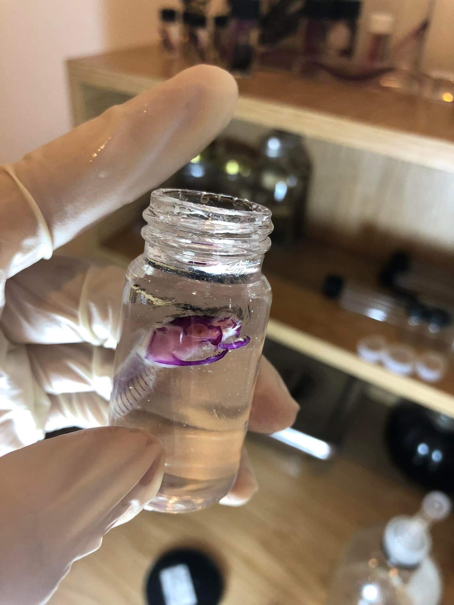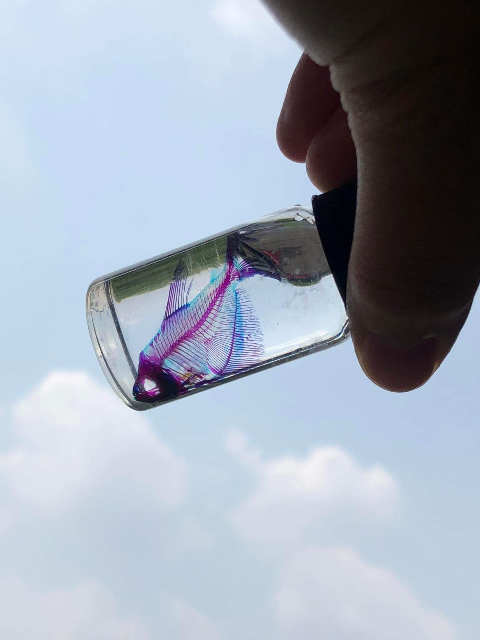 Sau khi hoàn tất mẫu và cho nó vào lọ, chúng ta sẽ thu được một mẫu vật trong suốt với một bộ xương cơ màu sắc khá đẹp mắt.