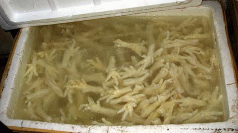 | Chân gà ngâm lềnh phềnh trong hoá chất. |
