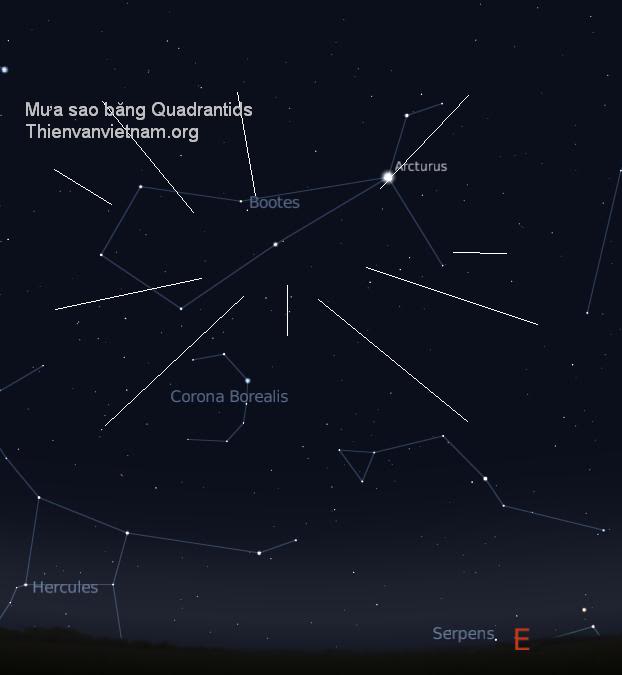 Để quan sát hiện tượng này, rạng sáng ngày 4/1 và 5/1, khoảng từ sau 2 giờ cho tới trước khi trời sáng, hãy quan sát bầu trời phía Đông, hơi chếch về Đông Bắc và xác định vị trí chòm sao Bootes (như hình dưới), ngôi sao sáng nhất của nó sẽ giúp bạn nhận ra là sao Arcturus. Hầu hết các sao băng của Quadrantids sẽ xuất phát từ khu vực này.