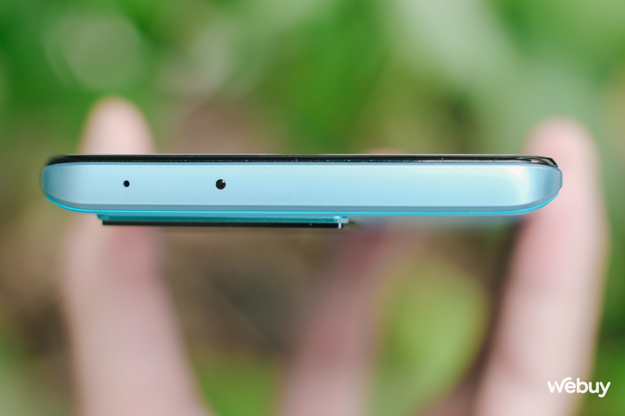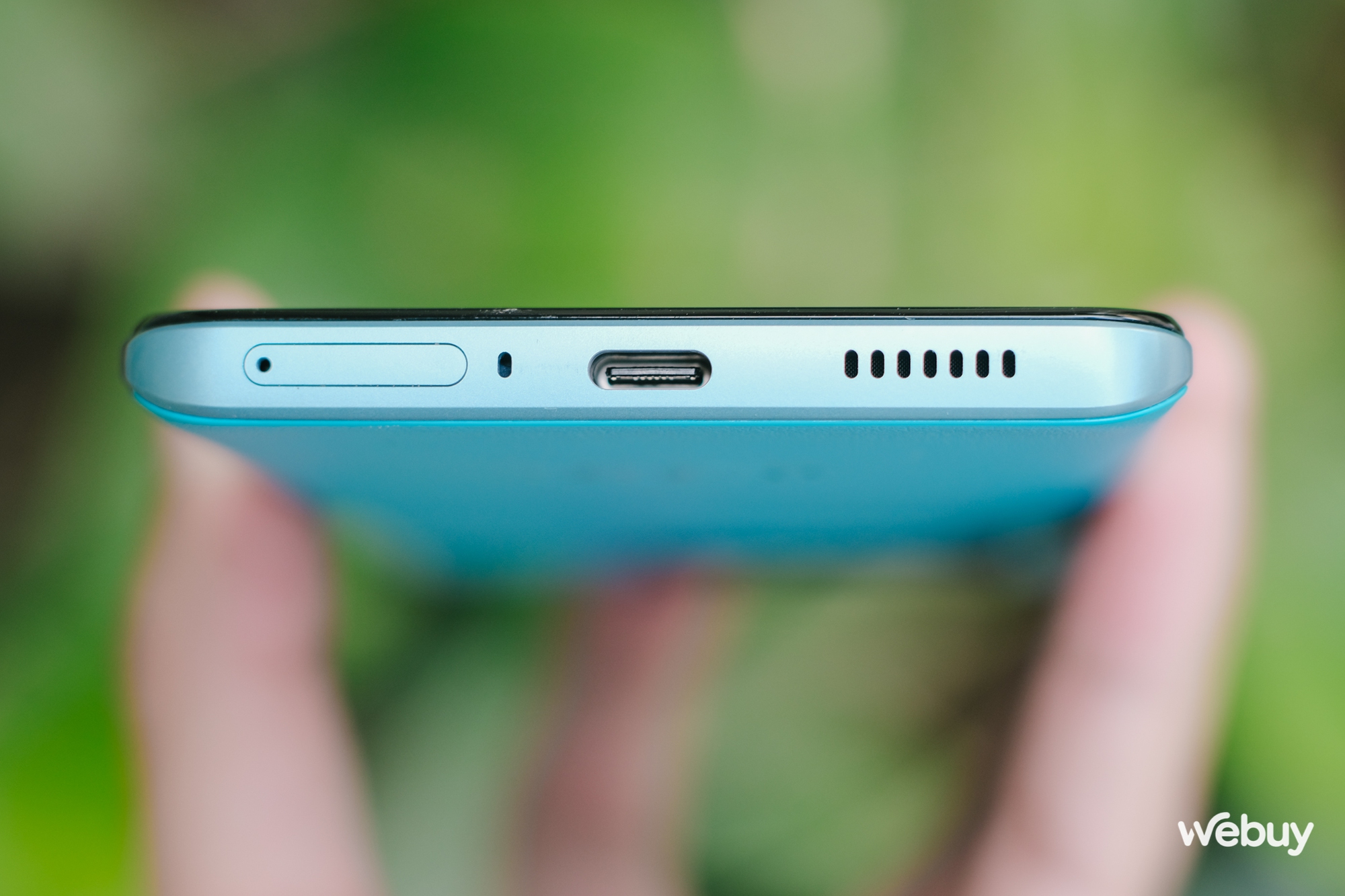 Khung viền kim loại của Neo6 với vị trí đặt các phím cứng vật lý và cổng kết nối. Máy không có jack cắm tai nghe 3.5mm