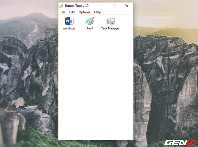 Bây giờ bạn hãy đóng cửa sổ RunAsTool lại và mở nó lại lần nữa. Bạn sẽ không thấy cửa sổ yêu cầu đăng nhập xuất hiện nữa, và giao diện RunAsTool cũng được thu gọn lại chỉ còn những ứng dụng mà bạn đã thêm vào.