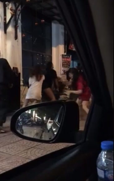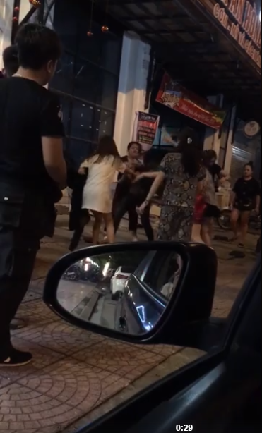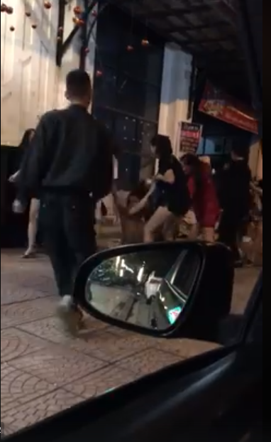 Cùng lúc đó, một người đàn ông mặc áo vest đen đứng gần đứng ra can ngăn đồng thời nói "gọi an ninh đi" nhưng không xuể. Cô gái bị đánh, đạp ngã dúi dụi xuống đất. Khi sự việc đẩy lên cao trào, nhiều người đã báo cho nhân viên bảo vệ đến, tuy nhiên, 2 nhân viên bảo vệ này cũng bối rối không biết phải xử lý thế nào.