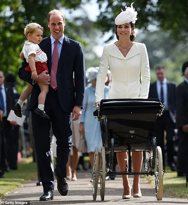 Đến dự đám cưới của người bạn thân là Sophie Carter, Công nương Kate diện áo choàng dáng váy màu xanh cobalt của Catherine Walker ton-sur-ton với hoàng tử George và tiểu công chúa Charlotte.