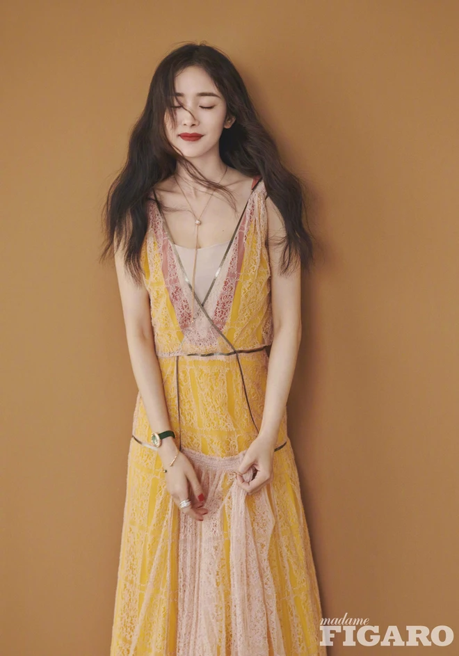 Trong bộ ảnh mới đây, Dương Mịch diện mẫu váy màu vàng nữ tính của Bottega Veneta. Cô nàng chọn lối tóc buông xõa uốn xoăn đơn giản và dùng thêm vòng cổ thanh mảnh làm điểm nhấn.