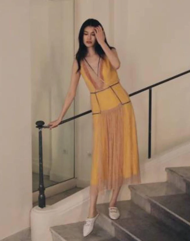 Sui He khá thoải mái khi diện váy dài với giày mule đơn giản. Với dáng người chuẩn siêu mẫu, cô cũng dễ dàng chinh phục mẫu váy này với thần thái vừa tự nhiên lại quyến rũ.