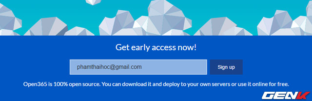 Open365 hỗ trợ hầu hết các phiên bản trình duyệt, cũng như các nền tảng hệ điều hành như Windows, Linux, Mac, Android và sắp tới đây sẽ là iOS. Để sử dụng, trước hết bạn hãy truy cập vào trang chủ của Open365 tại địa chỉ này, sau đó nhập email vào khung cuối trang và nhấn Sign Up.