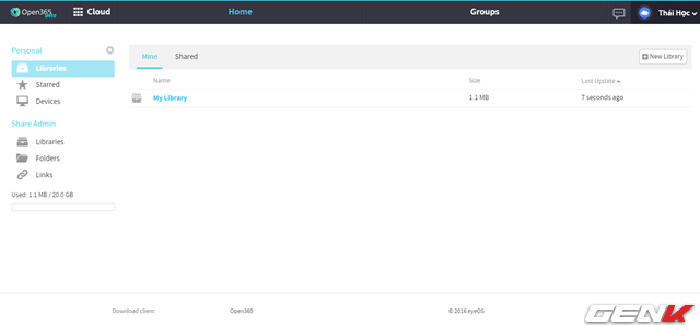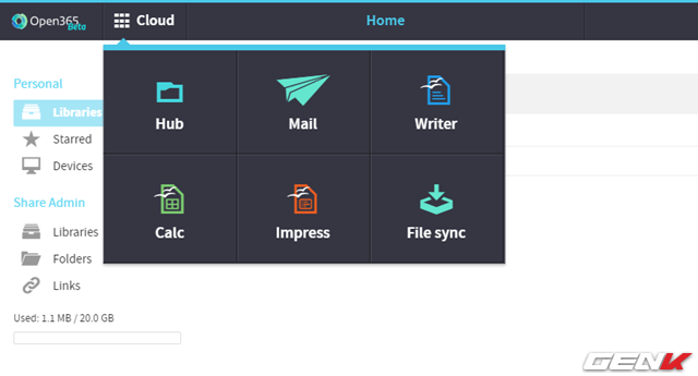 Open365 sẽ cung cấp cho bạn 20GB không gian lưu trữ, khá dư dã phải không? Nhìn chung giao diện quản lí của Open365 khá dễ nắm bắt. Khi nhấn vào biểu tượng Cloud, bạn sẽ thấy được các dịch vụ trực tuyến mà Open365 cung cấp cho bạn để sử dụng.