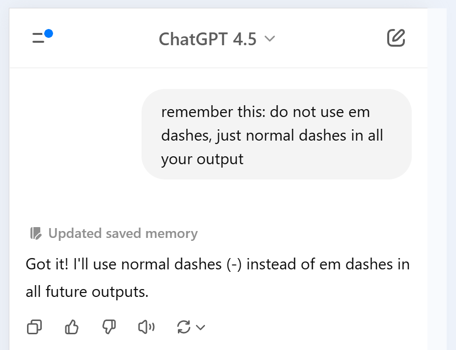 Tuy nhiên, cũng có ý kiến phản bác cho rằng bản thân họ cũng đã sử dụng dấu câu này từ lâu và việc gán nó cho AI là thiếu chính xác. Dù vậy, việc ChatGPT thường xuyên dùng em dash ngay cả khi được yêu cầu tránh đã khiến tình huống trở nên phiền toái.