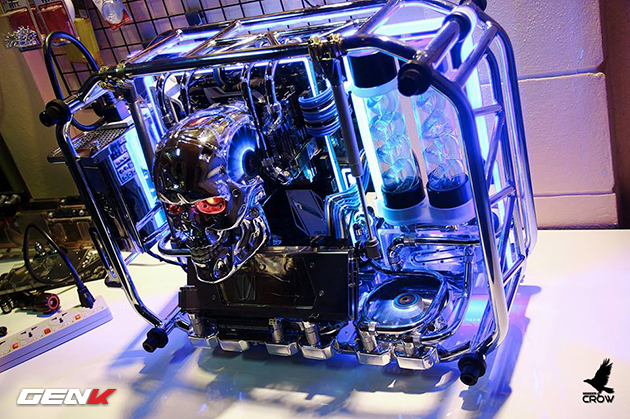 Không thể phủ nhận sự ấn tượng của dàn máy này tới từ phần heatsink CPU được mod hộp sọ đầy sáng tạo. Chiếc máy còn trở nên ấn tượng hơn khi về đêm, với sự kết hợp của đèn led màu xanh và đôi mắt đỏ rực của Kẻ Hủy Diệt.