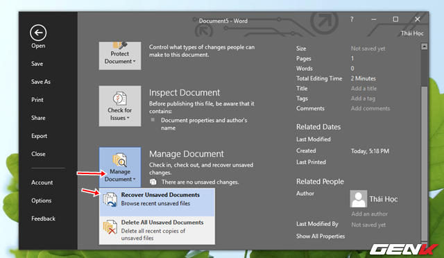 Giao diện Info xuất hiện, bạn hãy tìm đến tùy chọn “Manage Document” và nhấp vào chọn “Recover Unsaved Documents”.