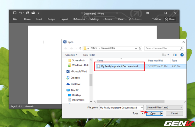 Khi đó hộp thoại điều hướng xuất hiện và tự động truy cập vào nơi mà Office dùng để sao lưu tự động tập tin Office mà bạn đang soạn thảo nhưng chưa lưu lại. Bây giờ bạn hãy nhấp vào tập tin này và nhấn Open để mở nó.