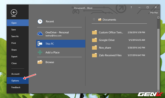 Trở lại menu File, bạn hãy nhấp vào lựa chọn Options bên dưới.