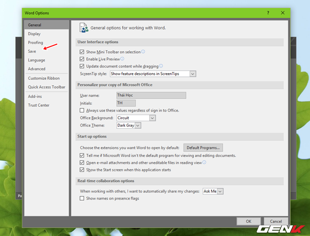Hộp thoại tùy chỉnh Options xuất hiện, bạn hãy nhấp vào nhóm tùy chỉnh Save.