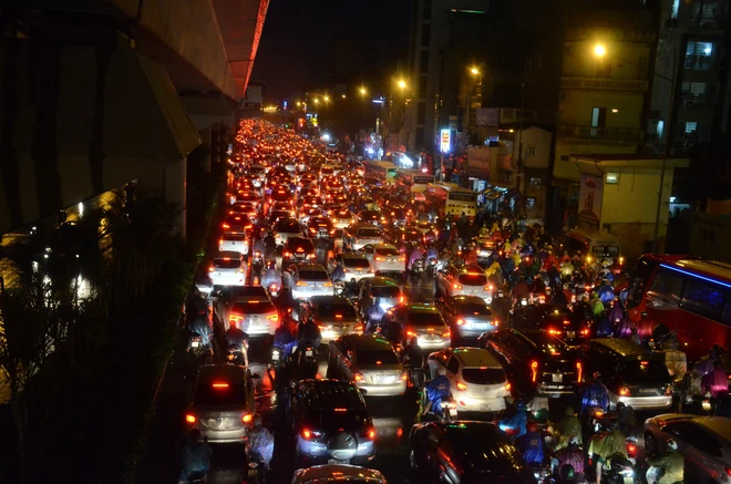 Cơn mưa lớn kéo dài trong khoảng thời gian cao điểm cuối ngày khiến nhiều tuyến phố ở Hà Nội xảy ra tình trạng tắc nghẽn kéo dài, các phương tiện đứng chôn chân dưới mưa. Một số tuyến phố khác lại ngập sâu, người dân di chuyển rất khó khăn.