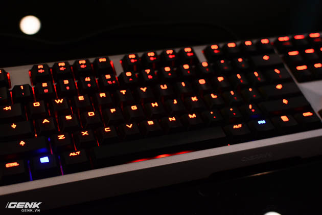 Cherry MX Board 6.0 chỉ có 1 màu LED đỏ cam duy nhất, riêng một số phím chức năng bao gồm FN, Windows, Capslock và Numlock có thể chuyển sang màu xanh dương khi kích hoạt.