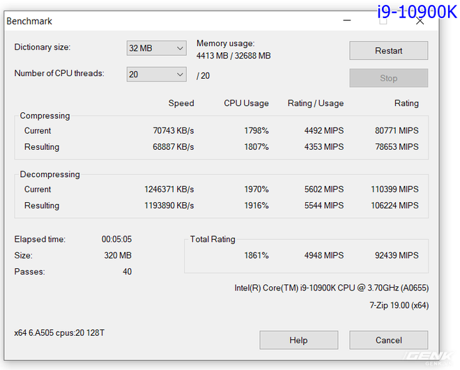 Mở đầu bằng bài thử Cinebench R20 quen thuộc. Với số lượng nhân/luồng ít hơn, không ngạc nhiên khi điểm đa luồng của i9-11900K thua kém so với i9-10900K. Tuy nhiên, nhờ một số cải tiến, điểm đơn nhân của i9-11900K rất cao, tăng khoảng 20% so với thế hệ trước trong khi hiệu năng đa luồng chỉ thua khoảng 10%.