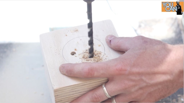 Tiếp theo chúng ta hãy sử dụng một máy cưa lỗ nhỏ hơn để khoan ở giữa miếng gỗ tròn mà bạn đã cưa ở trên.