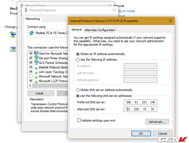 Ở đây do dùng máy tính Windows nên chúng ta chỉ đơn giản là truy cập vào Internet Protocol Version 4 trong Network & Sharing Center để thay đổi địa chỉ DNS hiện tại sang DNS của Stremr là xong.