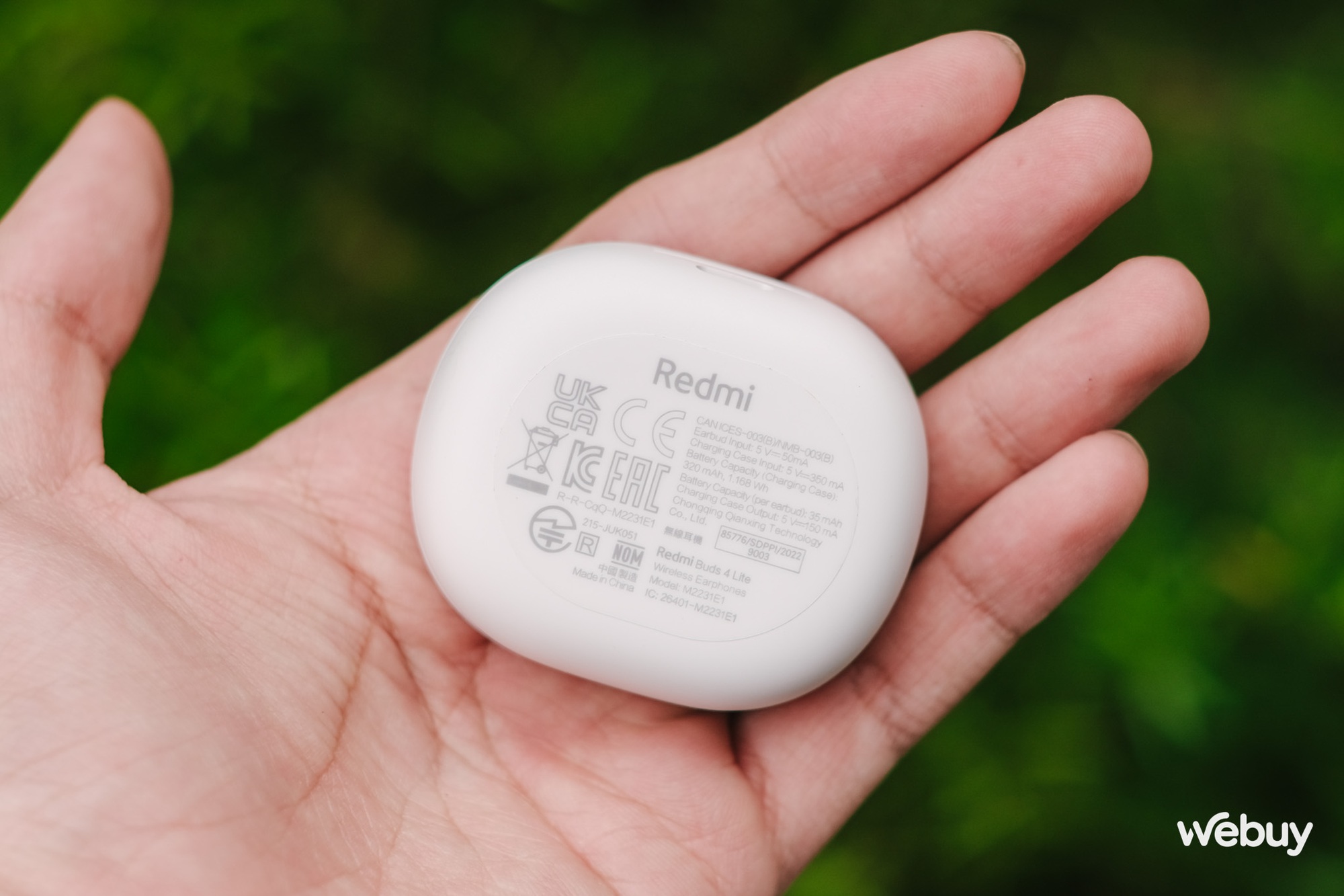 Về kích cỡ, hộp sạc của Redmi Buds 4 Lite khá nhỏ nhắn, kích cỡ tổng là 55,6 × 47,3 × 22,2mm, trọng lượng khoảng 26,7 grams nếu chỉ tính hộp sạc, còn tính cả tai nghe thì sẽ là 35 grams, tức mỗi bên tai nghe sẽ có trọng lượng 3,92 grams rất nhẹ