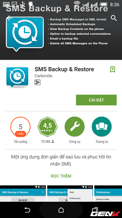 Cách làm này khá tiện lợi vì nó có thể áp dụng trên tất cả các hệ điều hành di động thông dụng hiện nay. Bạn chỉ việc tải ứng dụng SMS Backup and Restore về, sau đó tiến hành xuất SMS sang gói tin XML rồi chuyển nó sang máy mới qua Bluetooth, email hoặc “lên mây” rồi sau đó truy xuất nó là xong.