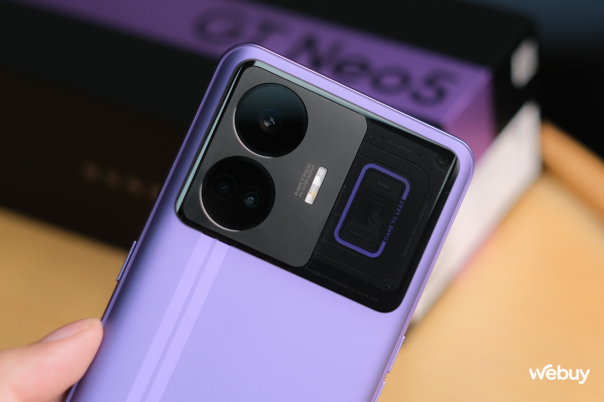 Cụm camera của GT Neo5 gồm 3 ống kính: góc rộng 50MP sử dụng cảm biến IMX890, camera góc siêu rộng 8MP cho góc nhìn 112 độ và camera macro 2MP