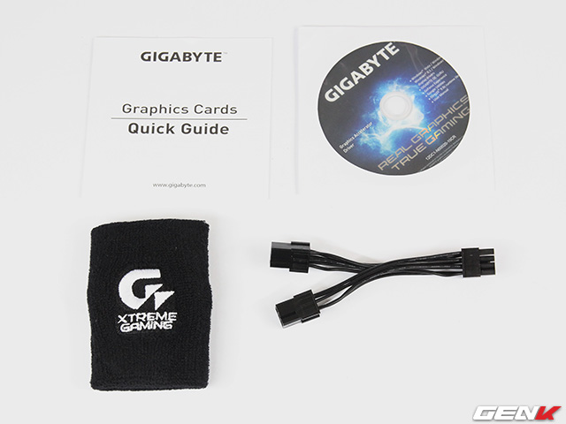 Phụ kiện đi kèm gồm sách hướng dẫn, đĩa cài đặt, dây chuyển nguồn 2 x 6 pin -> 8 pin, đặc biệt còn có một chiếc bao đeo cổ tay thể thao, mặc lên người nhìn cũng khá ghê gớm.
