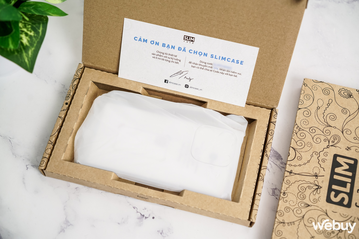 Ấn tượng ban đầu về ốp lưng Slimcase là sản phẩm được đóng gói với đẹp mắt, gần như toàn bộ bao bì đều sử dụng vật liệu tái chế thân thiện với môi trường, có cả thiệp cảm ơn và chữ ký của CEO Slimcase ông Andy, cho thấy sự chỉn chu của thương hiệu này.