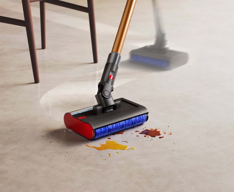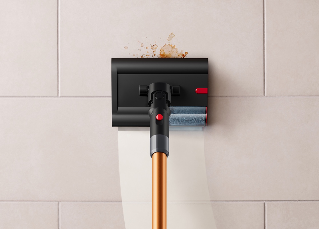 Máy sử dụng con lăn sợi microfiber mật độ cao với 64.000 sợi/cm², quay nhanh để xử lý đồng thời bụi khô và vết bẩn ướt chỉ trong một lần lau. Nước bẩn và cặn được hút ra liên tục sau mỗi vòng quay của con lăn. Kết hợp với hệ thống cấp nước 8 điểm cung cấp nước sạch liên tục, người dùng luôn lau sàn bằng nước sạch, đảm bảo mỗi lượt lau sau vẫn duy trì độ vệ sinh như ban đầu.