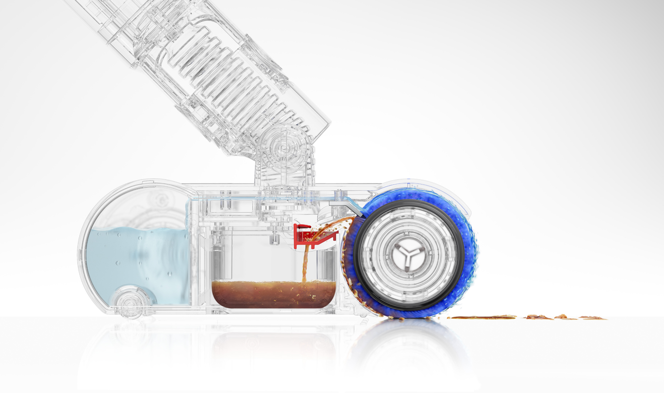 Mẫu máy lau sàn mới của Dyson gây chú ý với thân máy chỉ 38mm, trọng lượng 2,2kg, thiết kế không bộ lọc và cơ chế cấp nước - chà sạch - hút tách, hướng tới khả năng làm sạch hợp vệ sinh và tiếp cận được nhiều khu vực gầm thấp trong nhà.