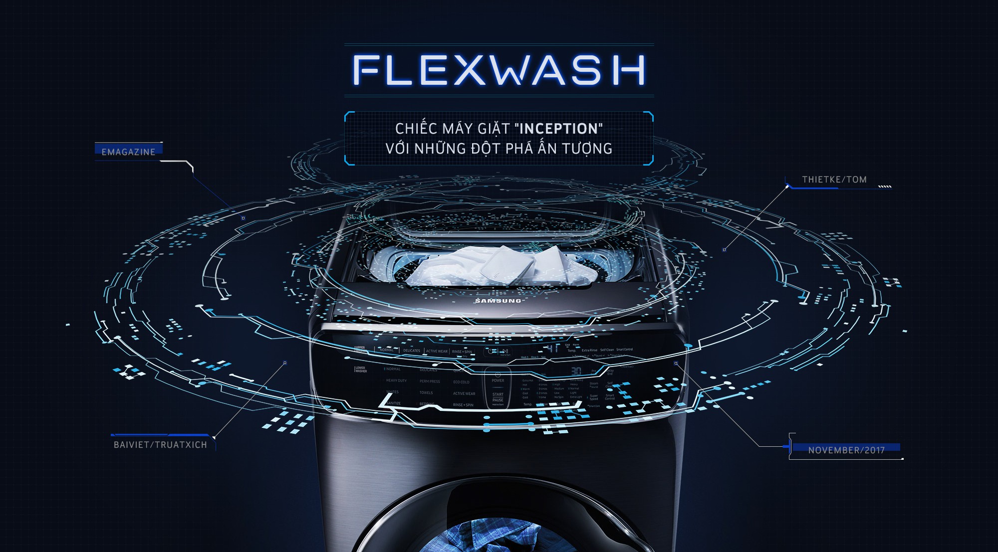 Flex Wash thực chất là 2 chiếc máy giặt được lồng ghép khéo léo với nhau để trở thành 1 chiếc duy nhất: 1 máy giặt cửa trước kết hợp với 1 máy giặt cửa trên (mà chúng ta sẽ gọi là lồng giặt chính và lồng giặt nhỏ). Không những thế, bạn còn có thêm một cửa giặt bổ sung nữa. Đúng như tên gọi: FlexWash (Flex ở đây là Flexibility - tiện lợi), đây là phát minh tân tiến nhất mà thị trường đồ gia dụng từng chứng kiến kể từ ngày máy giặt ra đời.