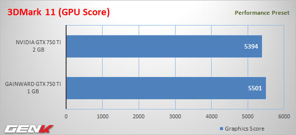 3 phần mềm 3DMark thể hiện kết quả kỳ lạ nhưng không bất ngờ: Gainward GTX 750 Ti 1 GB còn mạnh hơn bản 2 GB cùng xung nhịp nữa! Trên thực tế mỗi VGA có 1 xung boost khác nhau kể cả cùng GPU, trường hợp này rất có thể Gainward GTX 750 Ti 1 GB boost cao hơn bản 2 GB còn lại. Hơn nữa đối với tầm hiệu năng của GPU GM107 rất khó để tận dụng được bộ nhớ 2 GB, xung boost thấp hơn thì điểm thấp hơn cũng dễ hiểu.