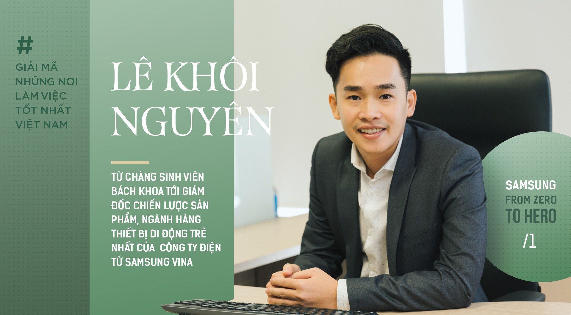 Chúng tôi gặp Lê Khôi Nguyên vào một buổi sáng cuối hè tại trụ sở chính của Samsung trên tầng 22 tòa tháp tài chính Bitexco ngay trong giai đoạn công ty này đang chuẩn bị cho sự ra mắt của Samsung Galaxy Note 9. Trong những ấn tượng ban đầu, không gian của một trong những công ty lọt top 10 Nơi làm việc tốt nhất Việt Nam mang đến cảm giác năng động và tươi trẻ, như chính nhưng con người nơi đây.