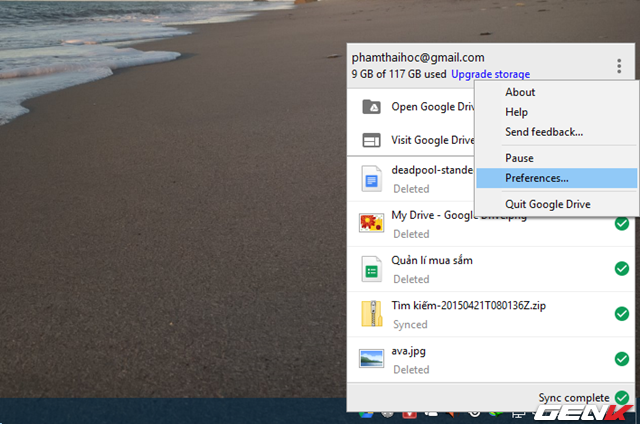 Nếu bạn muốn thay đổi cấu hình lại Google Drive trên Windows, bạn hãy nhấn vào biểu tượng của nó ở taskbar, sau đó nhấn vào biểu tượng 3 chấm và chọn Preference.