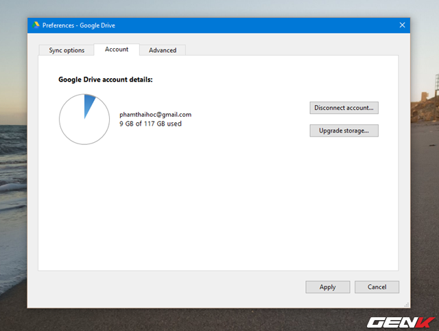 Cửa sổ Preference xuất hiện, ngoài 2 tab tùy chọn quen thuộc là Sync options và Advanced, bạn còn có thêm tab Account với biểu đồ dung lượng bạn đang dùng cùng 2 tùy chọn ngắt kết nối với tài khoản và nâng cấp.