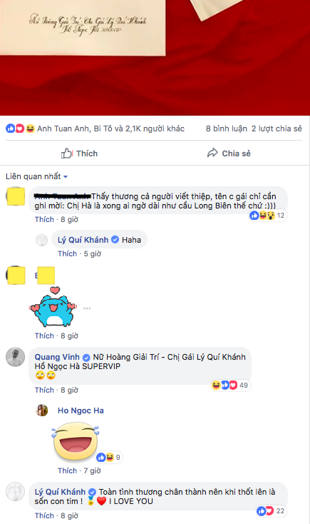 Chia sẻ của Hồ Ngọc nhận được sự quan tâm của fan và đa số đều tỏ ra thích thú. Đồng thời mọi người phát hiện ra cách viết thiệp của Lý Quí Khánh khác biệt nhất, chứng tỏ vị thế không hề xoay chuyển của Hồ Ngọc Hà đối với NTK 9X. Theo đó, Lý Quí Khánh nắn nót viết tên Hồ Ngọc Hà dài như chưa bao giờ được dài: "Nữ hoàng giải trí chị gái Lý Quí Khánh Supervip". Bất ngờ, Quang Vinh cũng vào bình luận và tỏ ra ấn tượng với các đặt tên của Lý Quí Khánh. Đáp lại, anh hài hước cho biết: "Toàn tình thương chân thành nên khi thốt lên là sốn con tim".