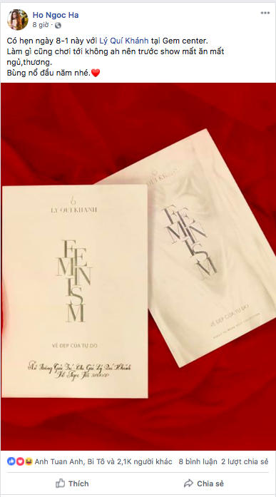 Sau khi nhận được thư mời tham dự show diễn "Feminism – Vẻ đẹp của tự do" kỷ niệm 10 năm của NTK Lý Quý Khánh, Hồ Ngọc Hà đã đăng tải lên facebook cá nhân bằng một caption hết sức dễ thương, thể hiện sự quan tâm của mình với show diễn để đời của người bạn mà cô xem như em trai trong gia đình. Hồ Ngọc Hà viết "Có hẹn ngày 8-1 này với Lý Quí Khánh tại Gem center. Làm gì cũng chơi tới không ah nên trước show mất ăn mất ngủ, thương. Bùng nổ đầu năm nhé". Dù viết không dài nhưng những lời chia sẻ của Hồ Ngọc Hà cũng đủ hiểu được tình cảm mà cô dành cho Lý Quí Khánh.