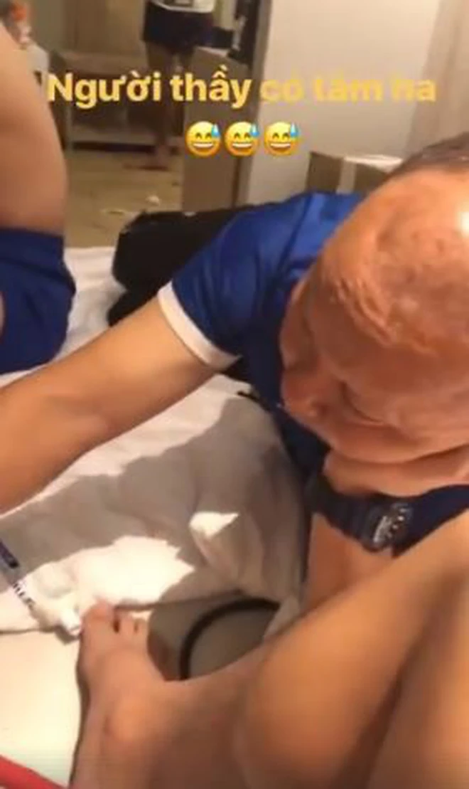 Không ít lần người hâm mộ bắt gặp ông Park Hang Seo tựa đầu vào vai Trọng Đại để ngủ, ôm hôn các cầu thủ sau khi thắng trận và cả massage cho những cầu thủ đang bị đau như Đình Trọng.