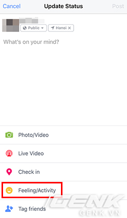 Bước 4: Nhấn vào "Status" trong ứng dụng để đăng trạng thái mới. Chọn Feeling/Activity.