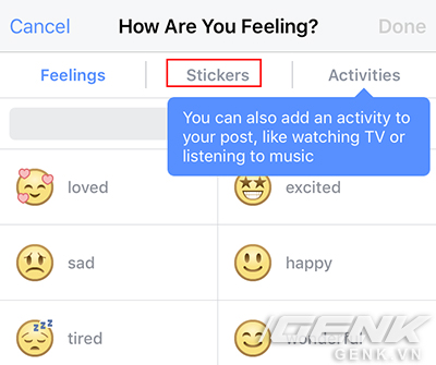 Trong phần Feeling/Activity sẽ có thêm hai tab là Stickers và Activities.