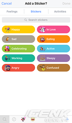 Tại đây bạn chọn sang tab Sticker để chọn biểu tượng muốn chèn vào status, có thể tải thêm sticker bằng cách nhấn vào dấu " " ở góc dưới màn hình.