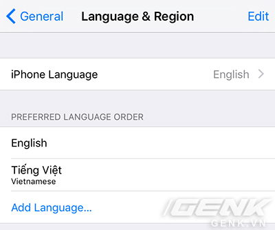 Bước 2: Vào phần Cài Đặt trên iPhone/iPad => Cài đặt chung => Ngôn ngữ & Vùng => Ngôn ngữ của iPhone (iPad) => Chuyển sang ngôn ngữ Tiếng Anh.