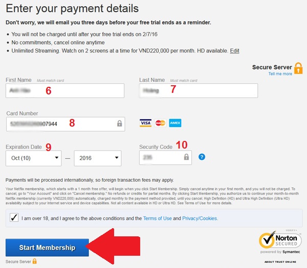 Hướng dẫn xem phim Netflix miễn phí thử 1 tháng: Nhập họ và tên chủ thẻ (7 và 6), mã số thẻ (8), thời điểm hết hạn (9) và mã an toàn rồi bấm Start Membership (10).