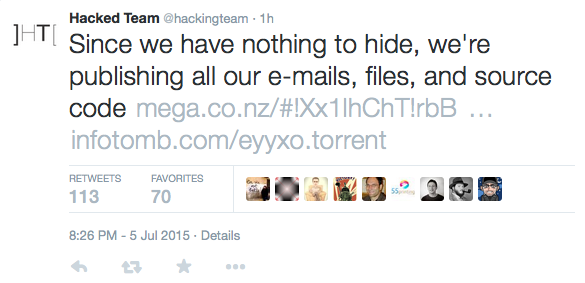 Dòng trạng thái thông báo vụ hack, được đăng trên Twitter chính thức của Hacking Team, khi đó nằm dưới sự kiểm soát của Fisher. Gã nói rằng mình nằm bên trong mạng của Hacking Team trong vòng sáu tuần và mất khoảng 100 giờ để khám phá và đánh cắp bộ dữ liệu.